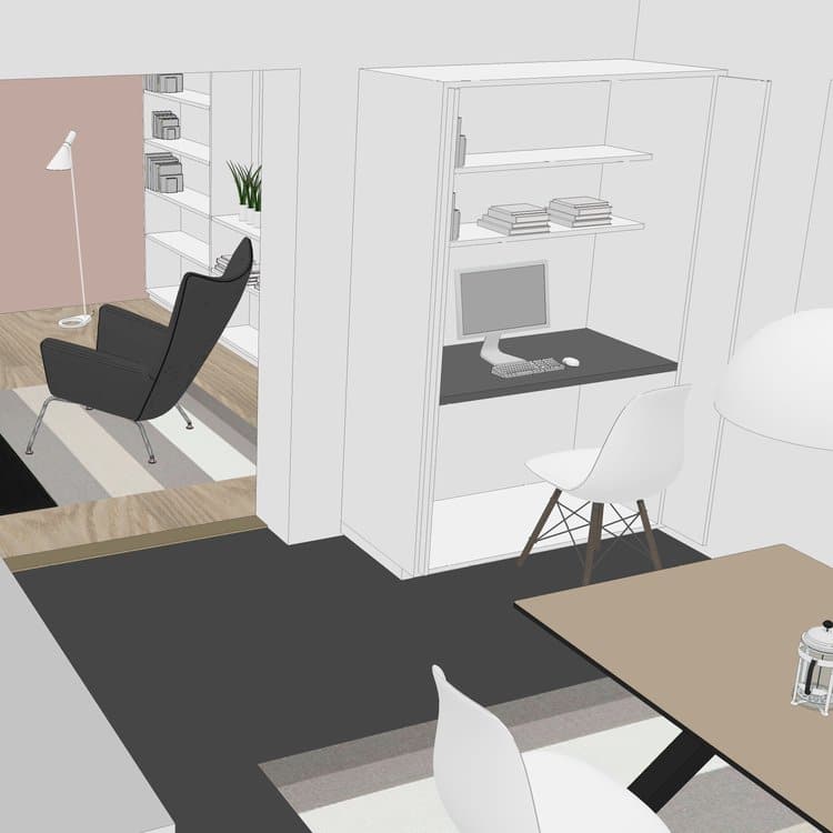 Indretning af en mindre arbejdsstation i et køkken/alrum for en kunde i Odense. Kravet var, at der skulle kunne lukkes helt af for arbejdspladsen, som kunne rode en del. Det blev løst med et skab fra et køkkenfirma, hvor lågerne kan skubbes ind i skabssiderne. Når stolen flyttes hen til spisebordet og lågerne lukkes, er arbejdsdagen slut.