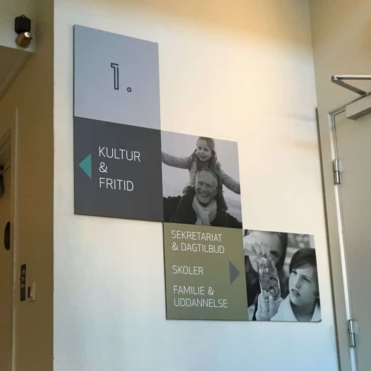To forvaltninger flyttede til nyt lejemål og opgangen var ualmindelig trist. For at lede besøgende ind på en god måde, udformede jeg skiltningen som dekorative elementer med klare signaler, i et format man kunne få øje på og aflæse tydeligt.