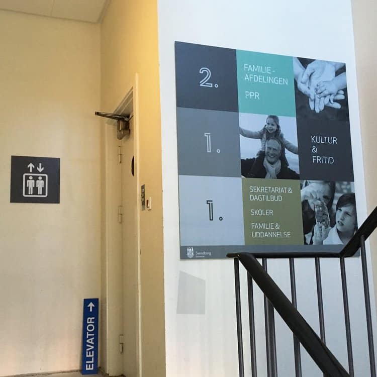 God skiltning byder indenfor og viser den besøgende vej på en enkel og overskuelig måde. Forvirring skaber utryghed. Jo mindre man skal læse – jo bedre. Derfor bruger jeg ofte billeder og piktogrammer som her hvor elevatoresskiltet erstattes af et let aflæseligt symbol.